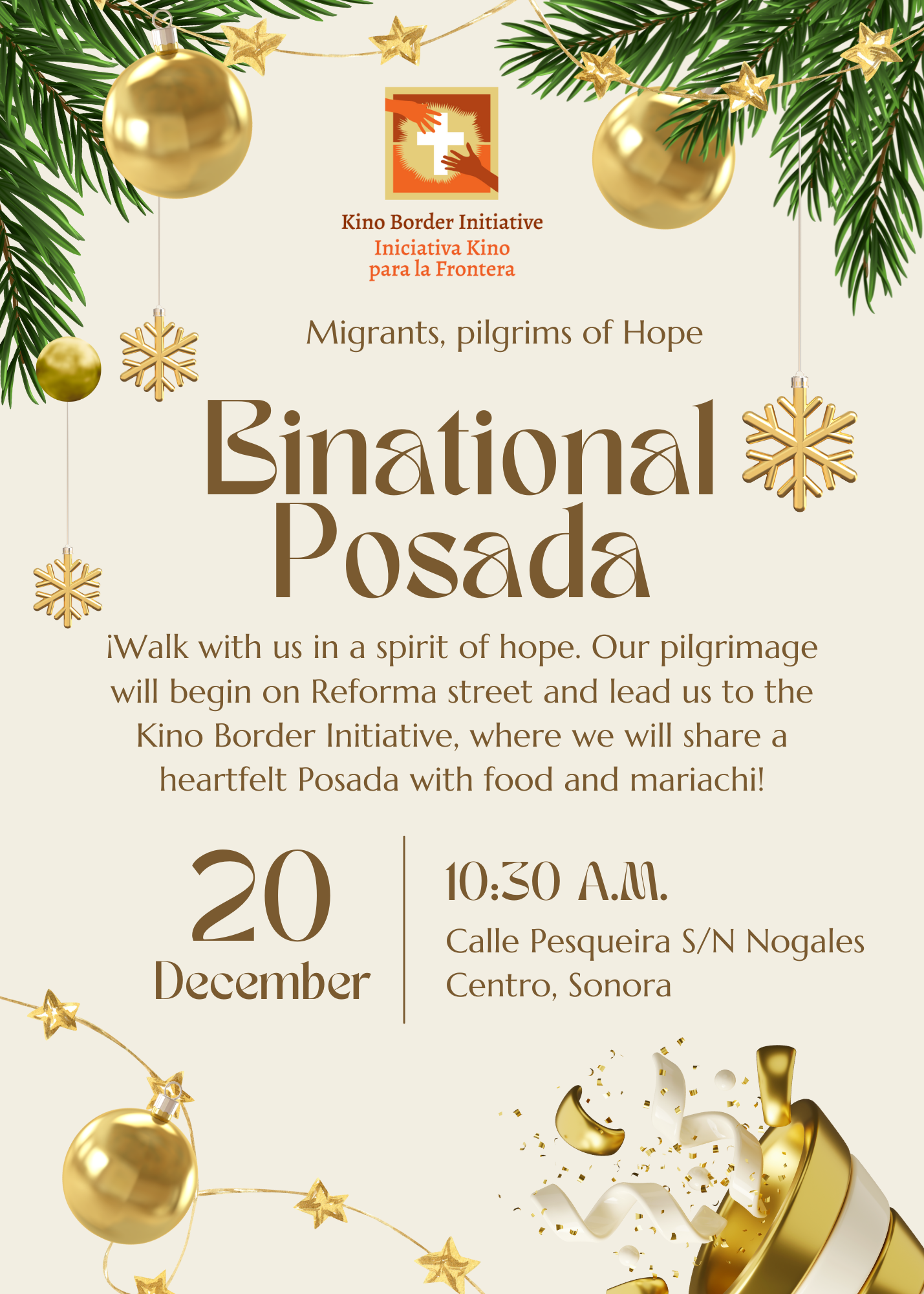 Camina con nosotros en un espíritu de esperanza mientras avanzamos juntos hacia un lugar de acogida y solidaridad. Nuestra peregrinación comenzará en la calle Reforma, donde nos reuniremos como una sola comunidad unida en la fe y la compasión. Paso a paso, nos dirigiremos hacia la Iniciativa Kino para la Frontera, acompañando las historias, los sueños y las luchas de migrantes y familias que buscan dignidad y seguridad. Allí, a las 10:30 a.m., compartiremos una Posada sentida y alegre, llena de oración, música y gozo, dando la bienvenida a todos con comida y mariachi. Que esta peregrinación sea un signo de nuestro compromiso de construir puentes de entendimiento, hospitalidad y paz.