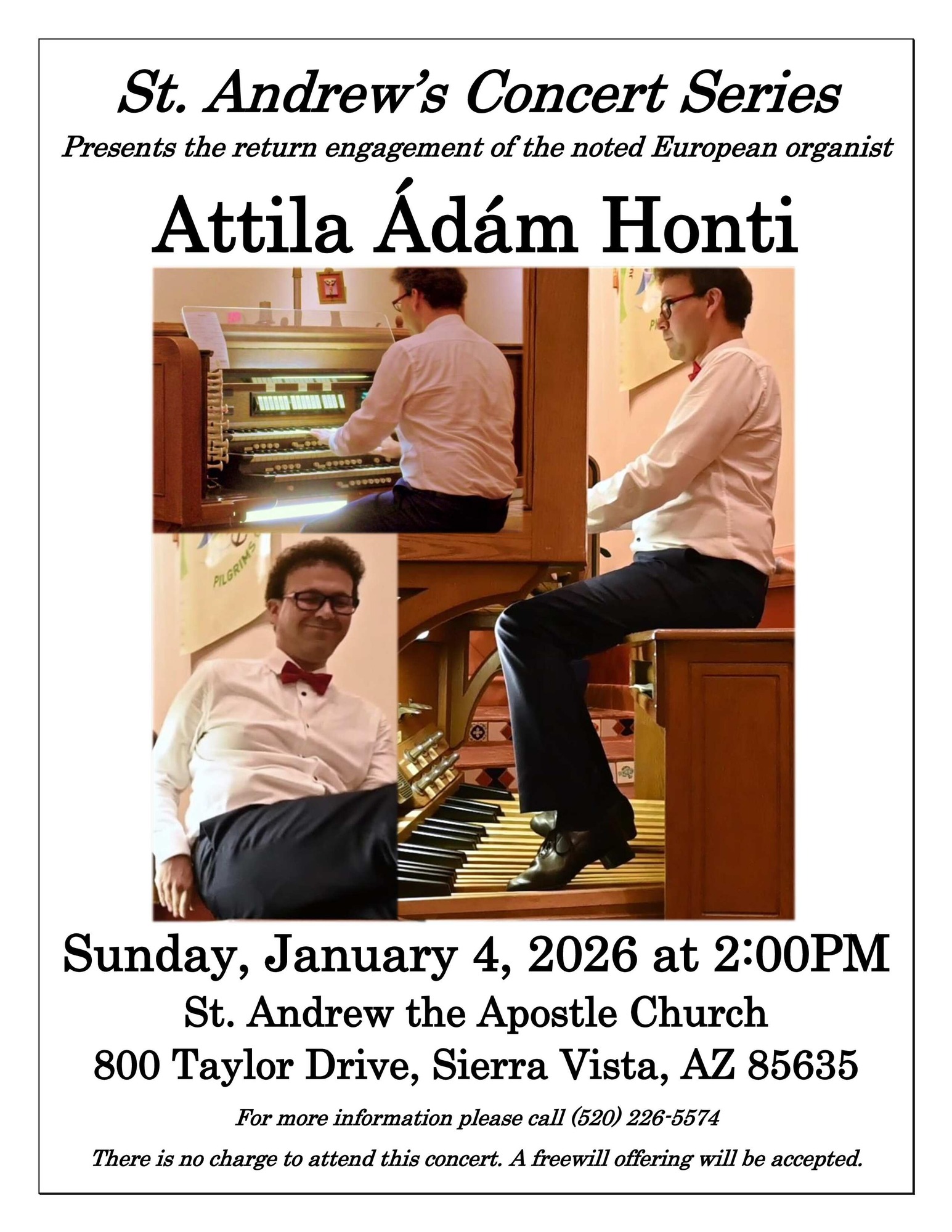 Attila, who performed at St. Andrew’s in August is returning to thrill us again with his incredible skills at the organ. The concert will be on Sunday afternoon January 4, at 2 pm at St. Andrew the Apostle Catholic Church, 800 Taylor Drive in Sierra Vista. There is no charge to attend this concert, a freewill offering will be accepted. For more information please call (520) 226-5574.