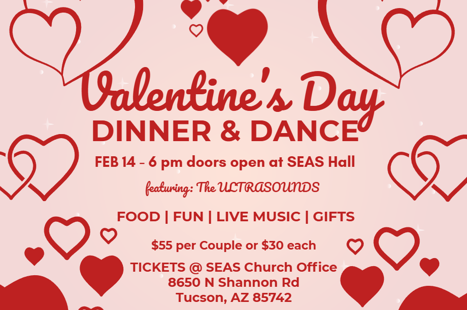 On February 14, SEAS Knights of Columbus will host a Valentine's Day Dinner & Dance featuring live music at 6pm in the Hall/Gym. The event is a benefit for the Ultrasound Initiative-- to raise money for an ultrasound machine to help pregnant mothers make life-affirming decisions to preserve the lives of their unborn children in southern Arizona.