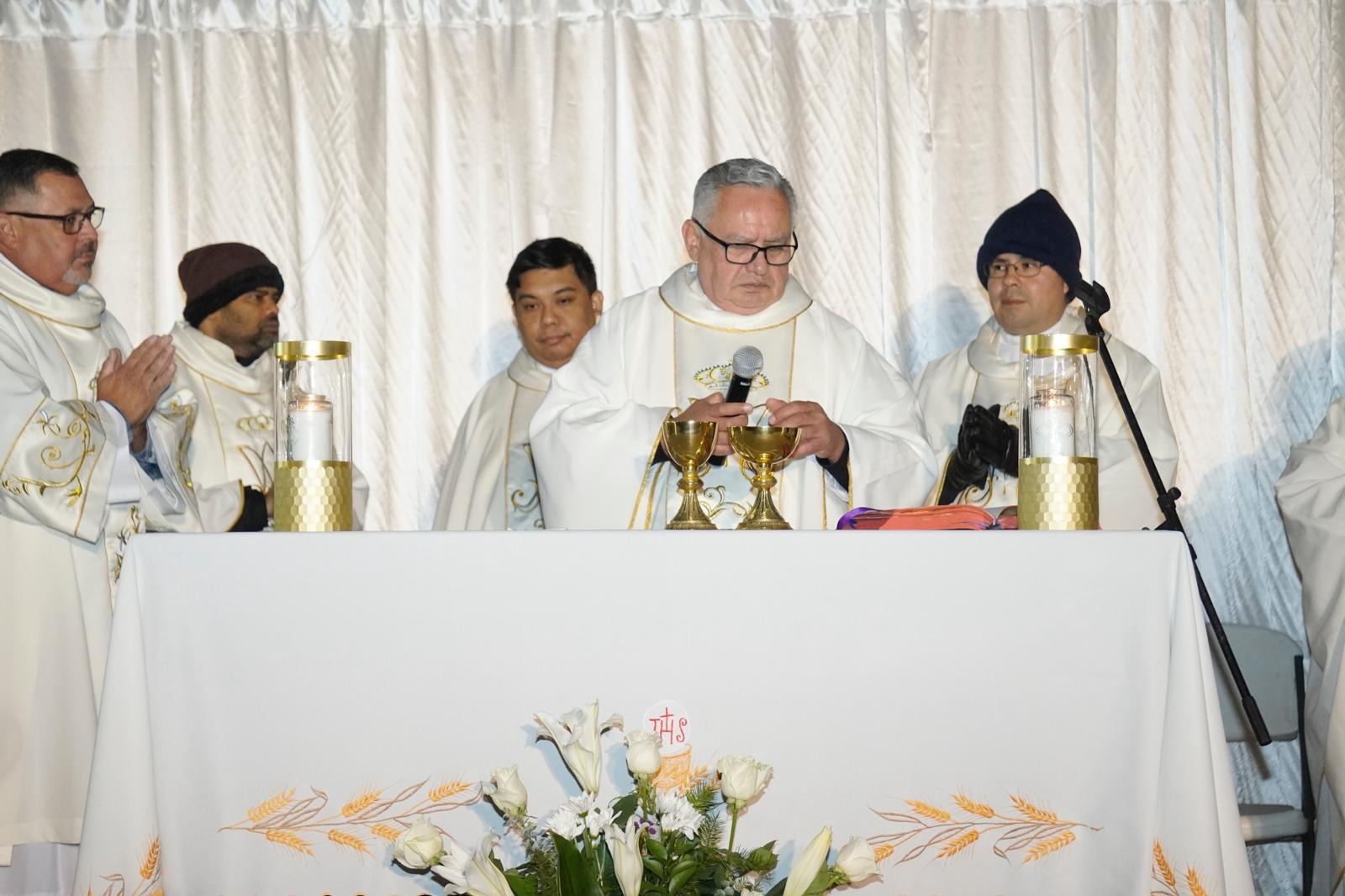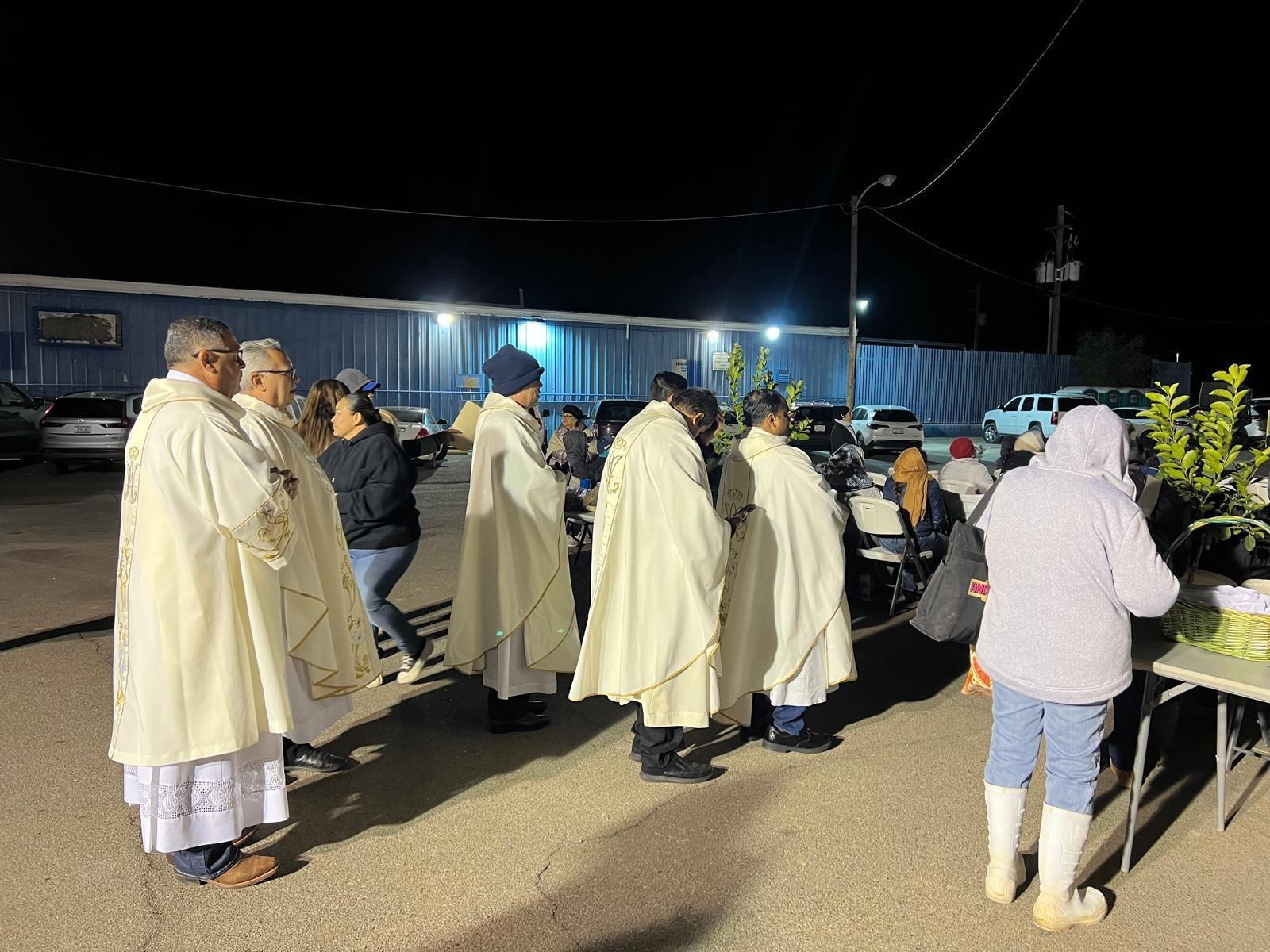 Faith, gratitude, and the hard work of the agricultural community were united once again on the border's edge. At the heart of Yuma County's winter harvest season, the city of San Luis, Arizona, was the setting for the Annual Mass was chosen in honor of farmworkers, celebrated on Thursday, December 4th, at 3:00 a.m. The unusually early time for the Mass was chosen to pay tribute to the arduous and sacrificial labor of agricultural workers, many of whom wait for their buses starting at midnight to be transported to the fields of the region. The celebration gathered a large number of these farmworker brothers and sisters, accompanied by other community members who joined in a gesture of solidarity. The Mass was presided over by Father Manuel Fragoso Carranza and concelebrated by priests and deacons from the Yuma Vicariate, whose presence reinforced the spirit of unity, gratitude, and faith that permeated the entire celebration. In this same spirit of gratitude, attendees were able to view the exhibition "Manos que Siembran, Sueños que crecen” The display, which features 160 drawings created by children from the Migrant Program of the Gadsden Elementary School District #32, constitutes a vibrant and moving tribute to their parents' daily efforts, inspiring awareness and solidarity around the dignity of agricultural labor and the hope carried by the new generations.